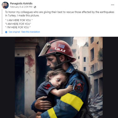 Фотографија грчког спасиоца који држи дете у наручју током земљотреса у Турској такође је дело вештачке интелигенције. Пошто је тема актуелна и са собом носи доста емоција, објављена фотографија се за тили час проширила друштвеним мрежама.