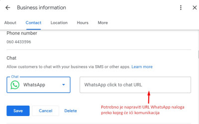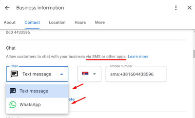 У оквиру Гугл бизнис профила за сада је подешено тако да морате да се определите за једну од доступних опција: СМС или Вотсап.