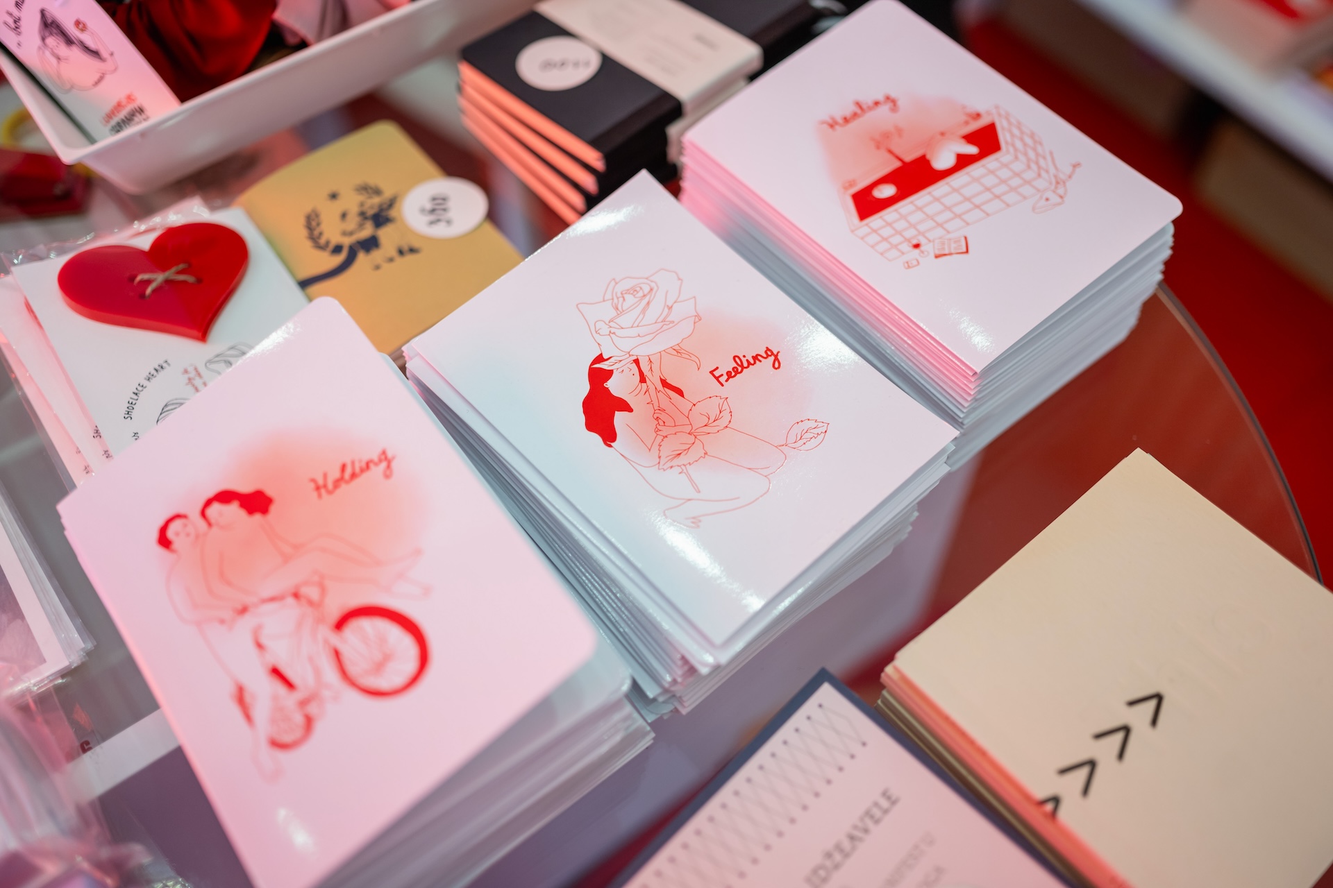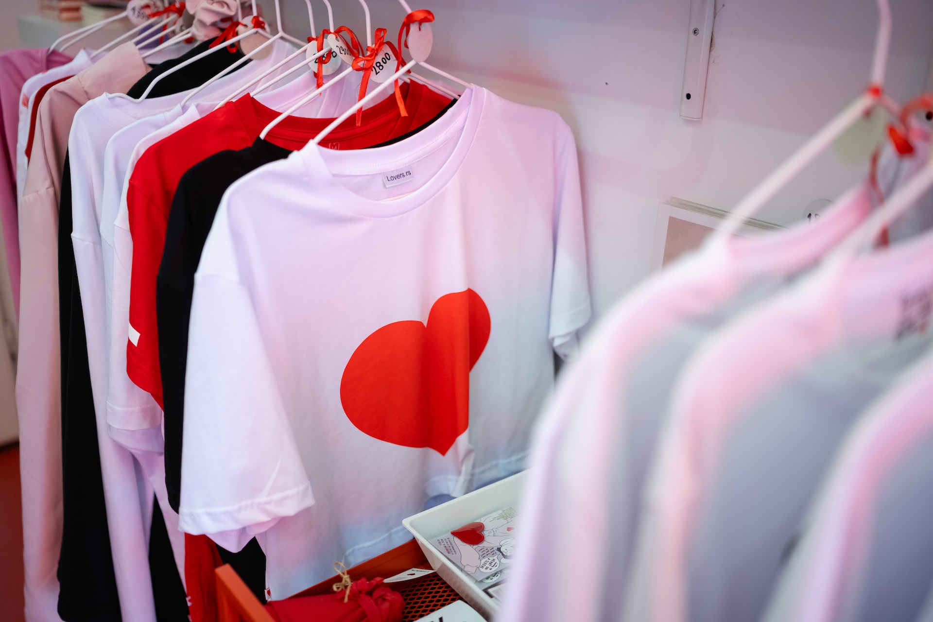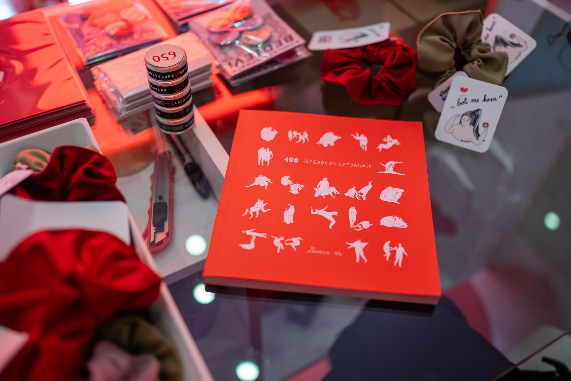 Такође, имамо срца од клирита која се стављају на пертле, као и три публикације: фанзин с цртежима, бојанку за одрасле и књигу илустрација „Сто љубавних ситуација”. Недавно је изашла, а на њој сам радила претходне две године, цртајући три дана у недељи по једну ситуацију. Део нашег асортимана су и артикли који су настали у колаборацији с другим брендовима, као што је Срце на тањиру, производ који смо израдили здруженим снагама с Јеленом из студија Made of Dust.