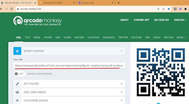 Први корак јесте да убаците URL на који ће отићи особа која је скенирала ваш код. Препоручујемо да URL обогатите информацијама, како бисте у аналитици пратили колики је учинак имао конкретан QR, тако што ћете направити UTM таг.