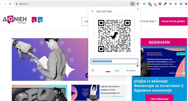 Интегрисан QR код из претраживача можете да копирате и проследите или сачувате на свом рачунару.