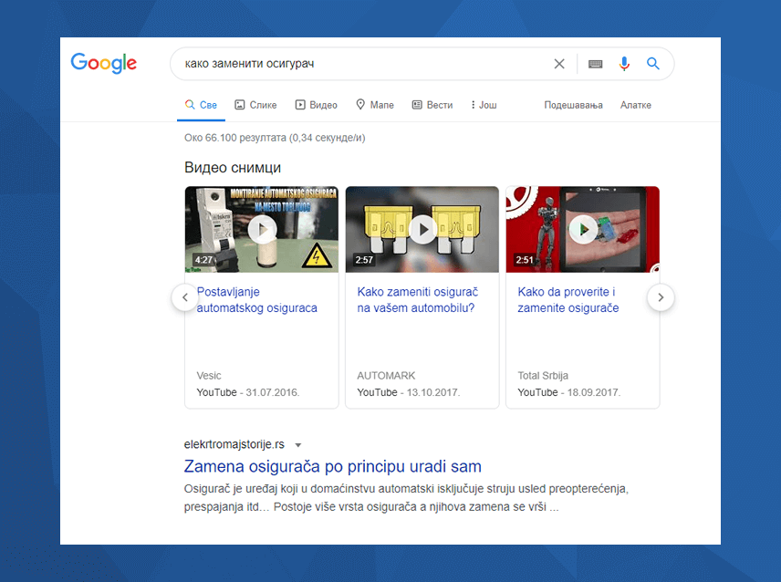 Пример изнад показује ситуацију у којој Гугл прво приказује видео резултате пре стандардних текстуалних. Ако снимите видео како се мења осигурач, ви ћете готово сигурно бити на врху и прескочити све друге.