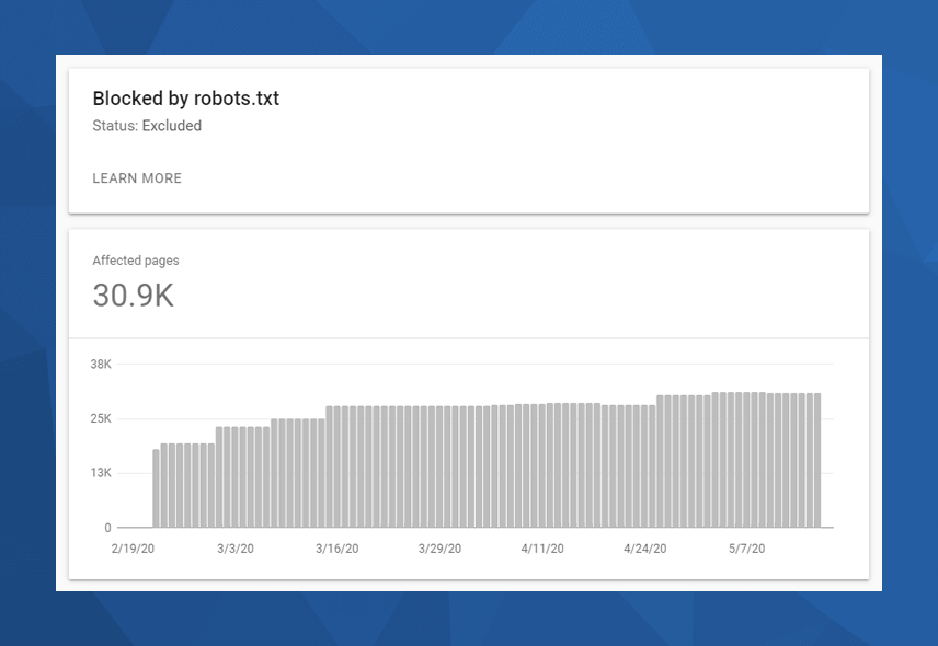 Слика изнад приказује извештај из алата Search Console у коме се види да је преко 30.000 страница сајта блокирано преко роботс.тxт фајла и да те странице Гугл није индексирао (excluded).