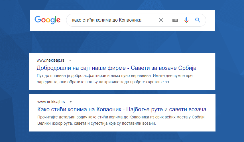 Наравно, пример број 2. Ту видимо прилагођен title таг који на квалитетан начин описује шта корисник може да прочита ако би посетио страницу.