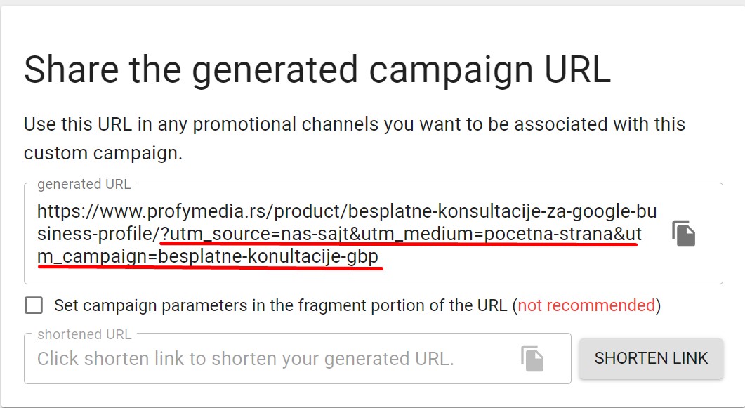Када попуните сва поља, обавезна и она која су вам важна за конкретан URL, на крају формулара ћете добити формиран линк који треба да ископирате и поставите где сте планирали (newsletter, друштвена мрежа, коментар, итд.)